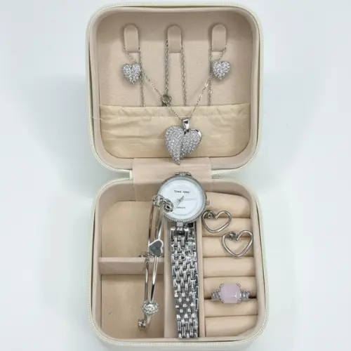 Coordinated 5-Piece Set: Includes a quartz watch, winged-heart pendant necklace, heart-shaped stud earrings, a minimalist heart bangle, and a pink stone statement ring.”Time One” Quartz Watch: Features a classic white dial, clear numeric markers, and a sophisticated interlocking metal link bracelet.Romantic Design Language: Consistent heart motifs throughout the necklace, earrings, and bangle symbolize love and affection.Premium Statement Ring: A large, rectangular soft-pink center stone flanked by baguette-cut crystals for a touch of color and luxury.Travel-Ready Organizer: Housed in a high-quality, zip-around cream jewelry box with dedicated slots for rings, hooks for necklaces, and a protective pouch.High-Shine Finish: Crafted with a polished silver-tone finish and pavé-set crystals for maximum brilliance.Imported